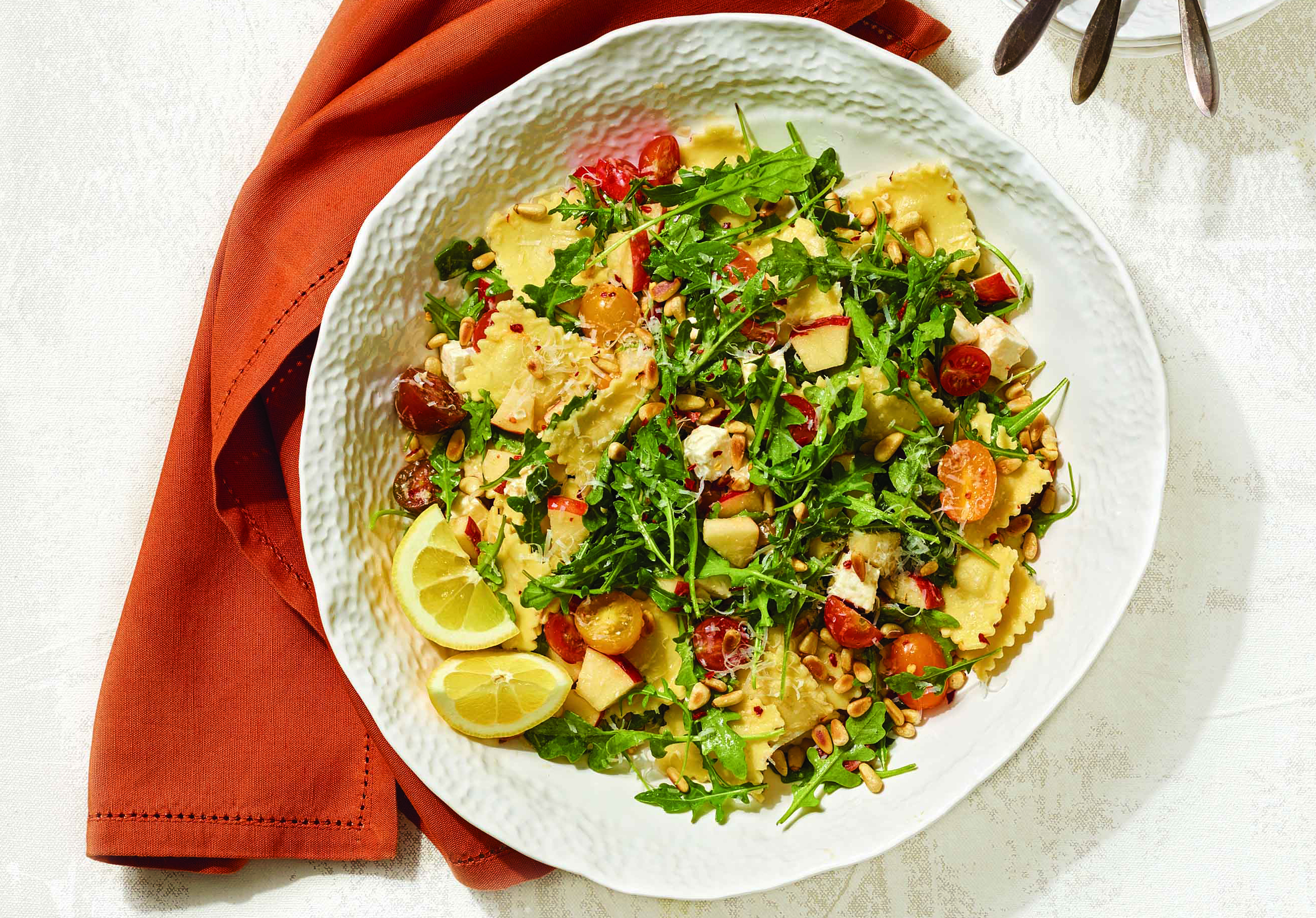 Warm Ravioli Salad with Marinated Cheese, Apple, and Tomato