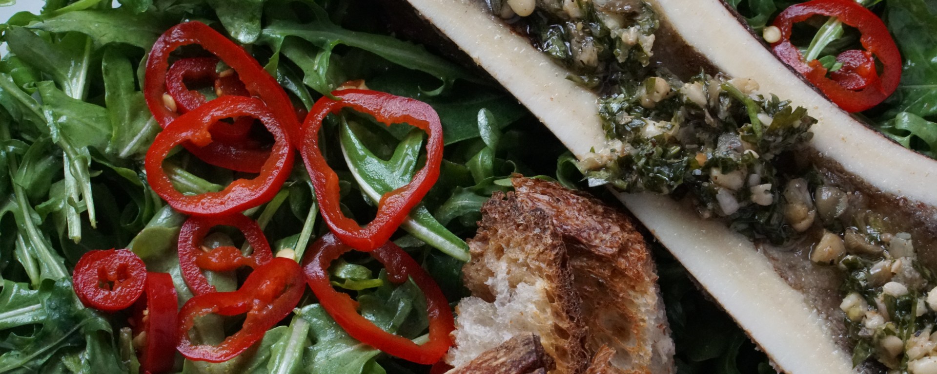 Roasted Marrow Bones with Gremolata, Toast Points, and Salad is my answer to that inevitable question that many chefs are asked, “What would be your last meal?” Most definitely, this is one of them.