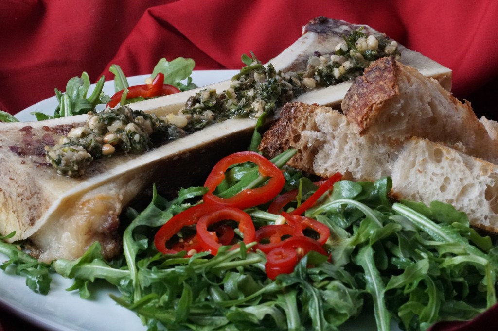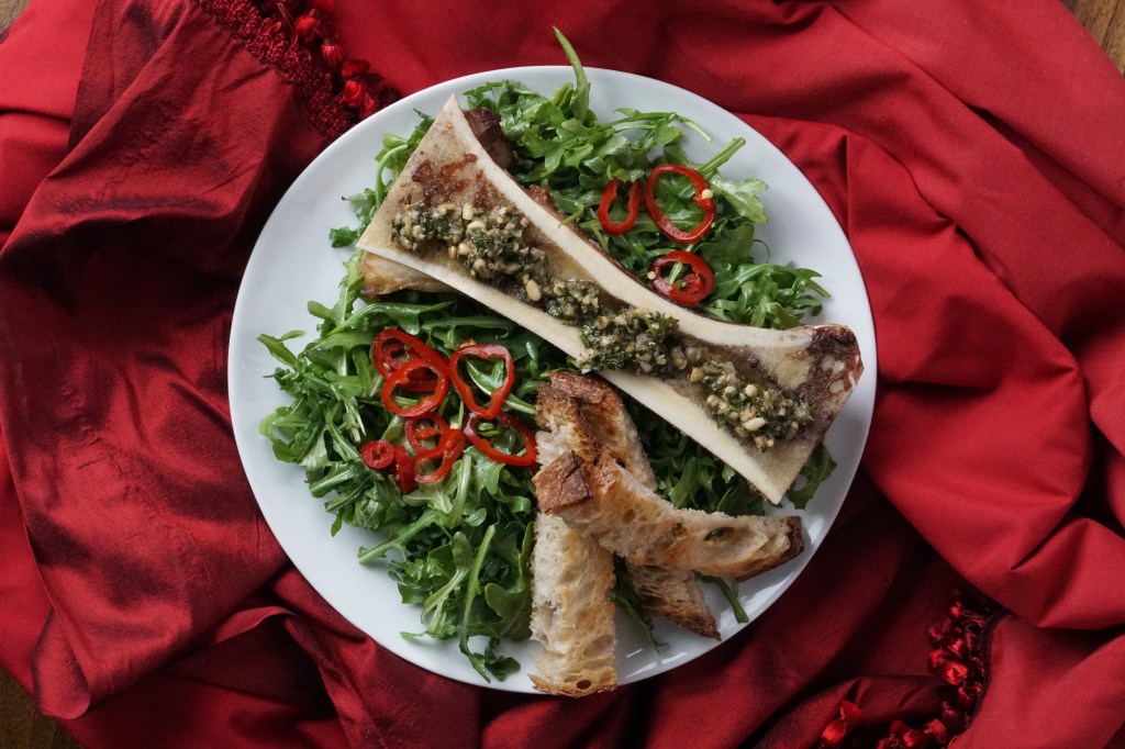 Perfect for an intimate birthday dinner or special occasion, the recipe for roasting the marrow bones is deceptively simple. Serve over a simply dressed salad with a few pickled hot pepper rings to dress up the plate, if you like. Top the bones with a generous portion of gremolata, which will add tartness and acidity to cut through the richness of the melt-in-your-mouth buttery, creamy, nutty flavor of the marrow itself. Spread over toast points, and you’ll be in heaven. I suggest a brisk Sauvignon Blanc or a sparkling Cava instead of a full-bodied red since the marrow’s flavor is rather delicate.
