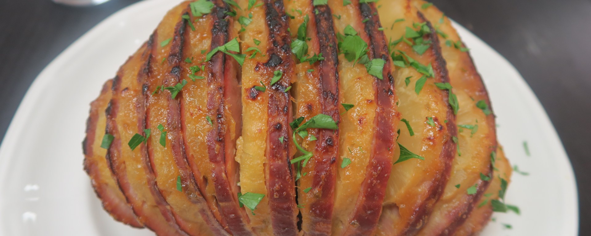 Just when you think you’ve seen everything in the world “hasslebacked” I submit for your consideration: Glazed Hasselback Ham with Pineapple.
