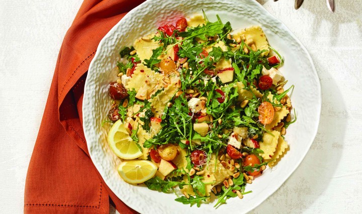 Warm Ravioli Salad with Marinated Cheese, Apple, and Tomato